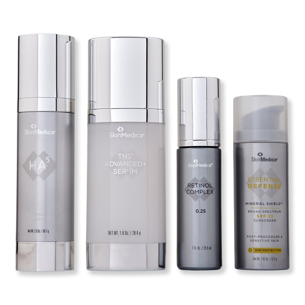 Essential Defense Mineral Shield Broad Spectrum SPF 35 Sunscreen: Active Ingredients: Titanium Dioxide 5.0%, Zinc Oxide 6.0%. Inactive Ingredients: Water/Aqua/Eau, Cyclopentasiloxane, Dimethicone, Polyglyceryl-3 Polydimethylsiloxyethyl Dimethicone, Butylene Glycol, Aluminum Hydroxide, Dimethicone/PEG-10/15 Crosspolymer, PEG-9 Polydimethylsiloxyethyl Dimethicone, Sodium Chloride, Caffeine, Camellia Oleifera Leaf Extract, Sodium Citrate, Dimethicone/Vinyl Dimethicone Crosspolymer, Triethoxysilylethyl Polydimethylsiloxyethyl Hexyl Dimethicone, Stearic Acid, Ethylhexylglycerin, Phenoxyethanol TNS Advanced+ Serum: Water/Aqua/Eau, Pentylene Glycol, Human Fibroblast Conditioned Media, Glycereth-7 Triacetate, Shea Butter Ethyl Esters, Glycerin, Ethoxydiglycol, Lactococcus Ferment Lysate, Whey Protein, Chlorella Vulgaris Extract, Saccharide Isomerate, Trifluoroacetyl Tripeptide-2, Dimer Tripeptide-43, Hydrolyzed Linseed Extract, Vitis Vinifera (Grape) Flower Cell Extract, Pyrus Malus (Apple) Fruit Extract, Hydroxyacetophenone, Tocopheryl Acetate, Propanediol, Xanthan Gum, Polyacrylate Crosspolymer-6, Polyacrylate-13, Polyisobutene, Sclerotium Gum, PEG-12 Dimethicone, Lecithin, Pullulan, Butylene Glycol, Sodium Citrate, Polysorbate 20, Aminomethyl Propanol, Dextran, Disodium EDTA, Phenoxyethanol, Ethylhexylglycerin Retinol Complex 0.25: Water/Aqua/Eau, Cetyl Ethylhexanoate, Glycine Soja (Soybean) Oil, Niacinamide, Polyacrylate-13, Squalane, Retinol, Palmitoyl Tripeptide-8, Dunaliella Salina Extract, Magnolia Grandiflora Bark Extract, Tocopherol, Tocotrienols, Ceramide 3, Bisabolol, Phytosterols, Squalene, Tocopheryl Acetate, Oryza Sativa (Rice) Bran Wax (Oryza Sativa Cera), Glycerin, Caprylic/Capric Triglyceride, Polysorbate 20, Butylene Glycol, Cetyl Palmitate, Laureth-23, Trideceth-6 Phosphate, Sodium Hydroxide, Dicaprylyl Ether, Lauryl Alcohol, Polyisobutene, Dextran, Potassium Sorbate, Disodium EDTA, Phenoxyethanol, Ethylhexylglycerin HA5 Rejuvenating Hydrator: Water/Aqua/Eau, Dimethicone, HDI/Trimethylol Hexyllactone Crosspolymer, Glycerin, Butylene Glycol, Polysilicone-11, Bis-PEG-8 Dimethicone, Sodium Acrylate/Sodium Acryloyldimethyl Taurate Copolymer, Sodium Hyaluronate Crosspolymer, Hydrolyzed Hyaluronic Acid, Sodium Hyaluronate, Vitis Vinifera (Grape) Flower Cell Extract, Vibrio Alginolyticus Ferment Filtrate, Alteromonas Ferment Extract, Porphyridium Cruentum Extract, Whey Protein, Plankton Extract, Trehalose, Urea, Serine, Algin, Caprylyl Glycol, Pullulan, Disodium Phosphate, Potassium Phosphate, Pentylene Glycol, Polymethylsilsesquioxane, Glyceryl Polyacrylate, Sodium Citrate, Sea Water, Sucrose Palmitate, Tocopheryl Acetate, Hydroxyacetophenone, Polysorbate 60, Propanediol, Potassium Sorbate, Citric Acid, Isohexadecane, Polysorbate 80, Silica, Decyl Glucoside, Tromethamine, Ethylhexylglycerin, Phenoxyethanol, Disodium EDTA